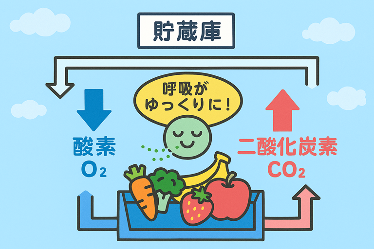 CA貯蔵は、青果物の呼吸を抑え、鮮度を長く保つ技術です。貯蔵庫内の酸素濃度を1〜3%に下げ、窒素ガスで満たすことで実現します。数か月に及ぶ貯蔵で出荷時期を分散し、高値で販売することで収益を安定させ、販路拡大にもつながります。